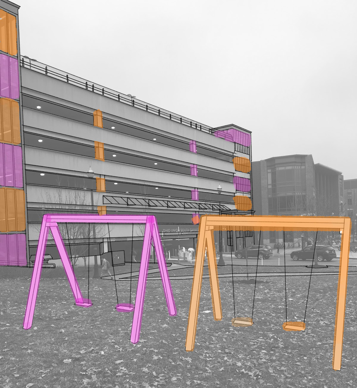 To create this moment of pause, we are envisioning multiple swings placed in the area between the two garages. The swings would be on both sides of the existing walkway, swinging parallel to the walls of the garages. Vertical poles, stretching up from the swings, would connect them to the garage. These poles would have lights on them that are activated by the swings’ motion. Each pole would curve at a right angle and extend into a level of the garage, continuing to travel along the ceiling and lighting up that level of the garage. The poles would lengthen to varying heights as they extend into different floors of the garage. As a result, each floor of the garage would have different colored lights stretched along the ceiling, dependent upon which poles are attached to it.