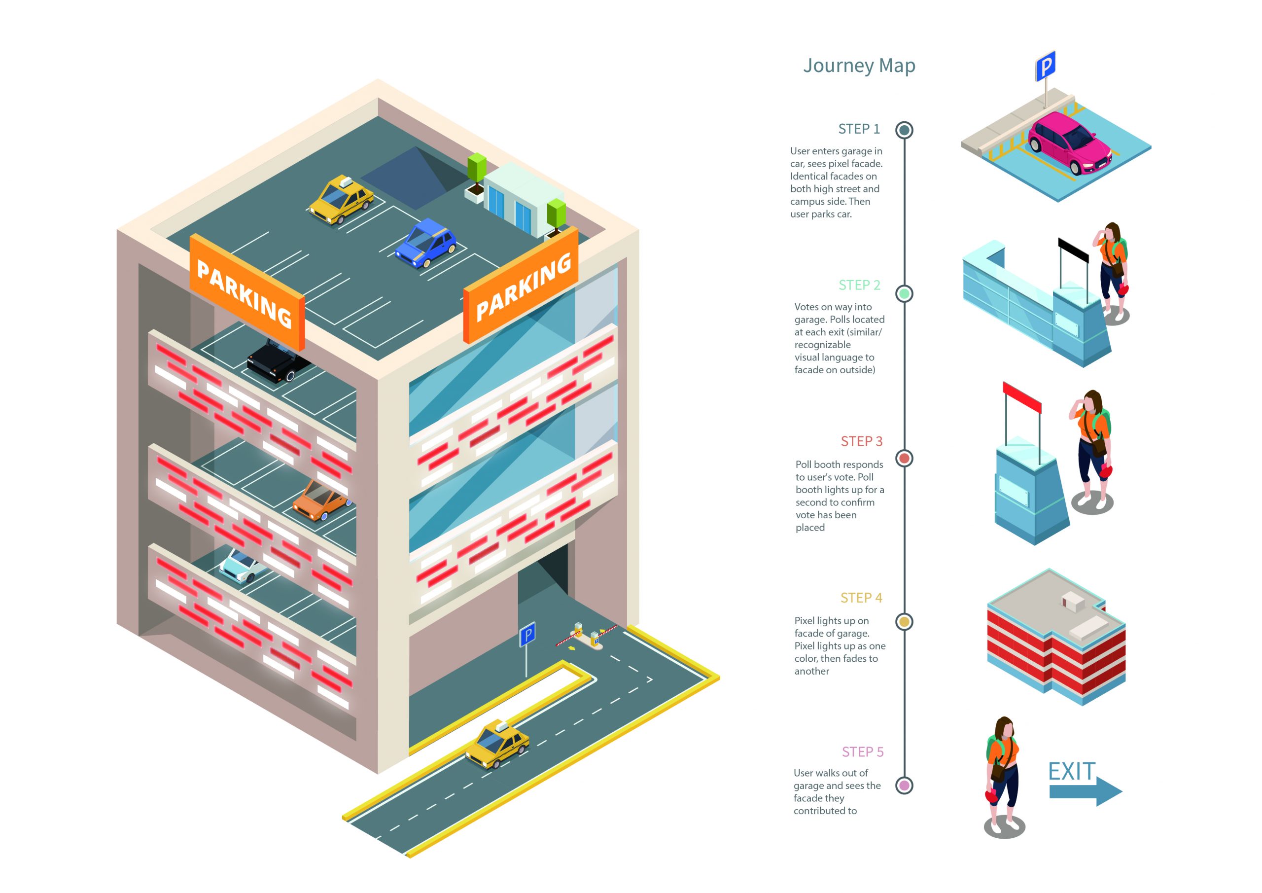 This project started with the title of “Floor Wars”. Floor Wars is a design prototype that focuses on using games to engage and empower the community to control the aesthetics of the garage. The concept manifests in dynamically changing lights controlled in masse by people interacting with the garage. Garage visitors are able to place their vote by selecting an answer on the voting board located by the stairs on each floor. Each answer corresponds to a different color, and the color of each floor’s majority answer is displayed on the garage façade. As the lights change color, they help bring the garage alive, at any hour of the day. This not only makes the garage considerably more visually interesting, both internally and externally, but can help inspire those within the garage. As people leave their mark by voting, it is as if the space has acknowledged their presence and changed from their interaction, making users feel noticed and part of a larger community.