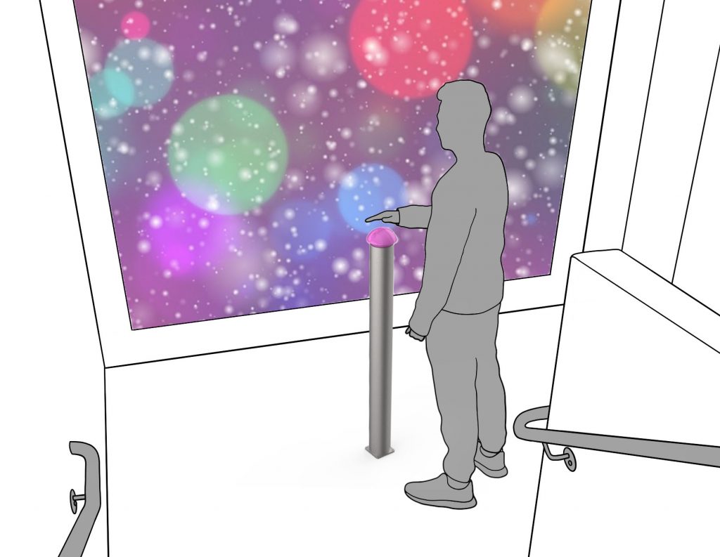 The second-floor wall in the southwest stairwell of the south union garage will be interactive. created using coded buttons that power a projection. Four color coded buttons will bring up different interactive digital tabs when they are activated by a user of the stairwell. Users can choose to experience positive news, nature, words of affirmation, or a game tab. The tabs will be open for a set amount of time and fade back into the cover photo that prompts users to participate until another button is chosen. This wall is meant to provide an outlet of engagement and self-expression alleviating the monotony of an everyday task.